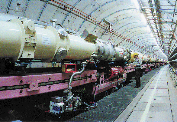 Das Photo zeigt einen Blick in den Beschleunigtunnel von HERA, der insgesamt 4.6 km lang ist. Zu sehen sind die Magnete, die den Elektronstrahl (rosa) und den Protonstrahl ( supraleitende Magnete) auf der Ringbahn des Beschleuigers halten. Dazwischen sorgen Hochfrequenzbeschleunigungsstrecken dafür, dass die Teilchen beschleunigt werden. Die beiden Teilchenstrahlen treffen sich an 4 Wechselwirkungspunkten um die herum riesige Detektoren aufgebaut sind. Mit diesen Experimenten lässt sich keine Ausdehnung der Elektronen und Quarks feststellen, das heisst, sie sind kleiner als 10**-18 Meter und damit mindestens 10 Milliarden mal kleiner als ein Atom.