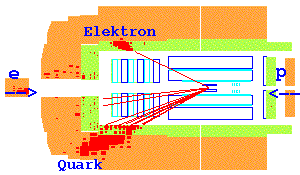 Der Detektor ist um die Zone herum gebaut, in der die Elektronen und Protonen usammenstossen. Er hat die Grösse eines Zweifamilienhauses und wurde von etwa 350 Physikern und Ingenieuren aus 13 Ländern 6 Jahre lang entwickelt und gebaut. Er muss alle Teilchen, die beim Elektron-Proton Stoss entstehen messen und identifizieren. Insgesamt hat er etwa 400000 elektronisch ausgelesene Detektorzellen. Bei der gezeigten Computerrekonstruktion eines registrierten Ereignisses wird ein Elektron um einen grossen Winkel abgelenkt, ebenso das Quark, das aber nicht als einzelnens Teilchen im Detektor erscheint sondern als Teilchenbündel (Jet). Aus der Messung und Analyse vieler Ereignisse dieser Art stammen unsere Kenntnisse über die Struktur des Protons ( und Elektrons) und die Kräfte, die zwischen den fundamentalen Teilchen wirken.
